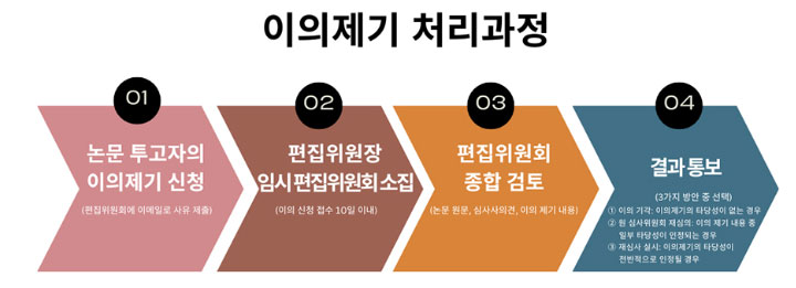 (3) 재심사 실시: 이의 제기의 타당성이 전반적으로 인정될 경우, 새로운 심사위원회를 구성하여 재심사를 진행하며, 이때 심사위원장은 편집위원장이 맡는다.