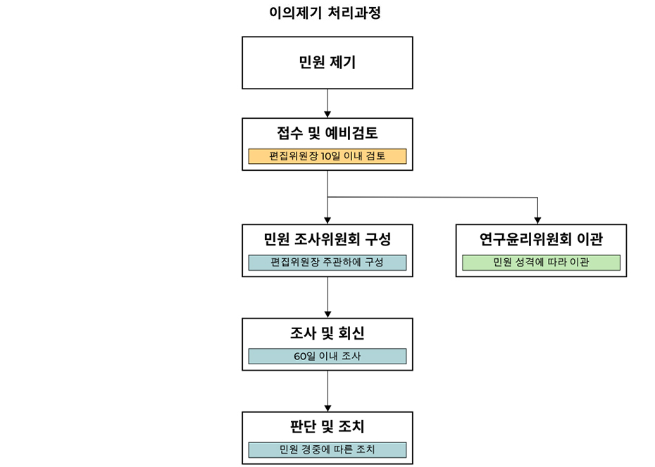 민원 조사위원회는 접수일로부터 60일 이내에 사실 조사 및 관련자(저자, 심사자 등)의 소명 절차를 거쳐 최종 판단을 내린다. 조사 결과는 민원인 및 관련 당사자에게 공식 서면으로 통보되며, 필요 시 해당 학술지 홈페이지에 공지될 수 있다.
